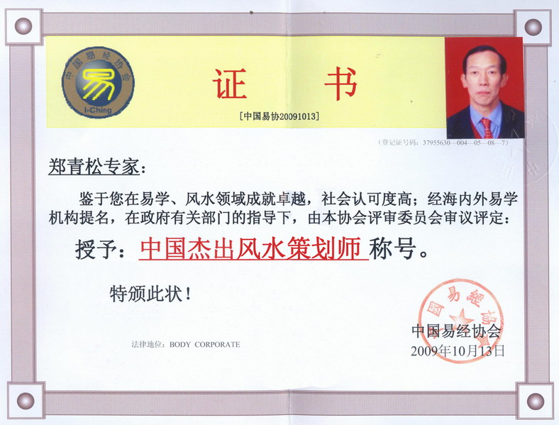 《全球易經文化協會》授予鄭青松 《世界著名易學命理名師》稱號, 查看大圖>> |