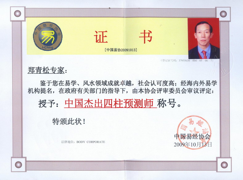 《中國易經協會》授予鄭青松 《中國杰出四柱預測師》稱號, 查看大圖>> |