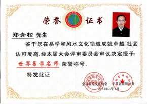 《全球易經文化協會》授予鄭青松 《世界易學名師》稱號, 查看大圖>> |